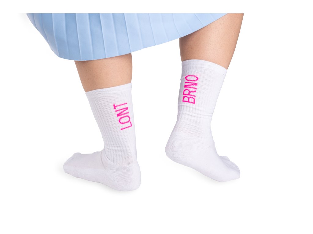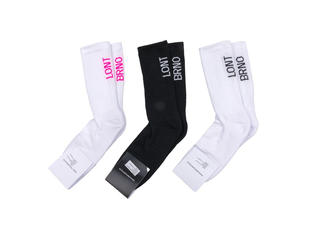 Ty správné ponožky přímo pro vás můžete volit z barev černá a bílá, z nápisů černých, bílých a růžových a jejich variant BRNO / BRNO nebo BRNO / LONT.